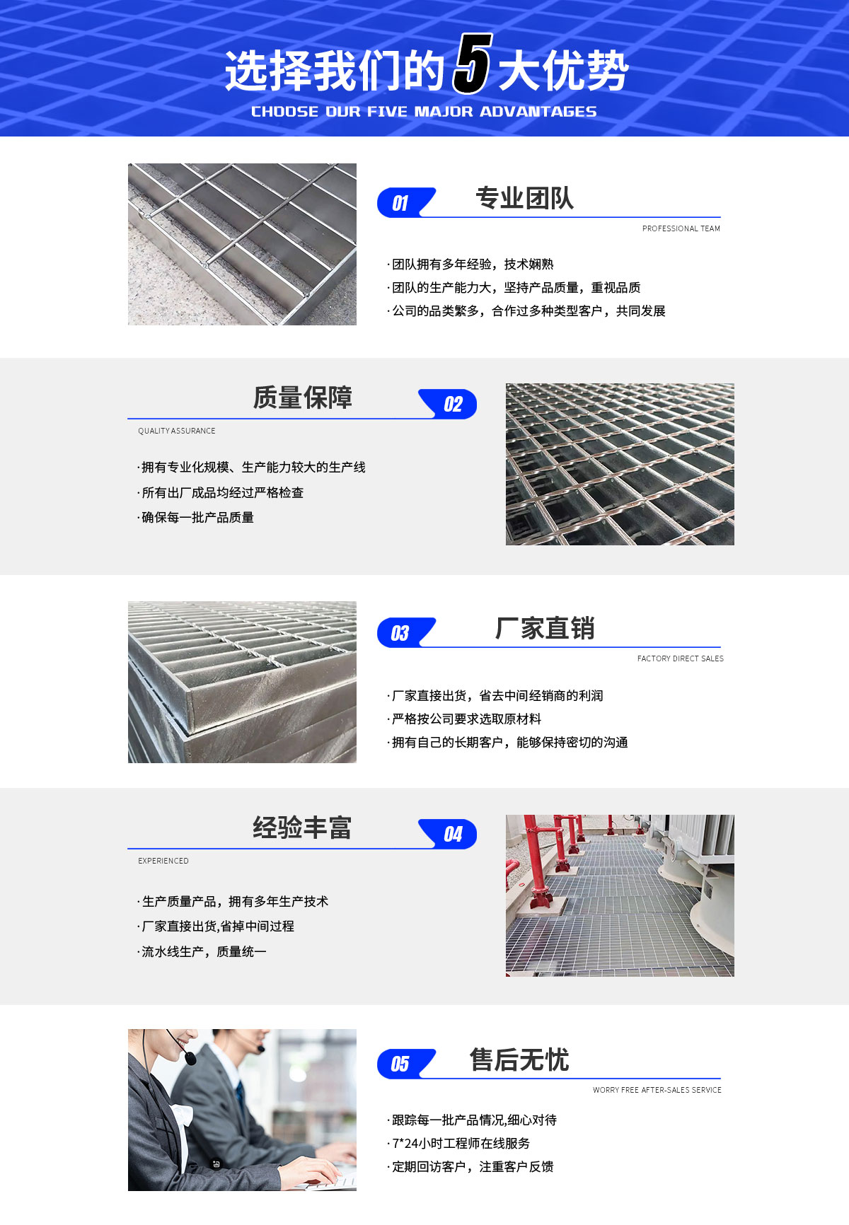 本廠生產船舶鋼格柵板、電廠鋼格柵板、光伏運維通道踏板、鍋爐房鋼格柵板、化工鋼格柵板、化油池平臺鋼格板、烤漆房鋼格柵板、碼頭鋼格柵板、平臺鋼格柵板、橋墩鋼格柵板、停車場鋼格柵板、脫硫塔鋼格柵板、污水廠鋼格柵板、洗煤廠鋼格柵板、箱變平臺鋼格板、油田鋼格柵板、玻璃鋼格柵板、不銹鋼鋼格柵板、防滑鋼格柵板、復合鋼格柵板、鋼格柵板、鋼梯踏步板、熱鍍鋅鋼格柵板、水溝蓋板、壓鎖鋼格柵板、異形鋼格柵板、重型鋼格柵板、球形立柱等。采用全自動大型壓焊生產線,美觀牢固。本廠始終堅持"質量好,用戶至上"的服務宗旨,贏得廣大用戶的贊譽, 產品遠銷大江南北